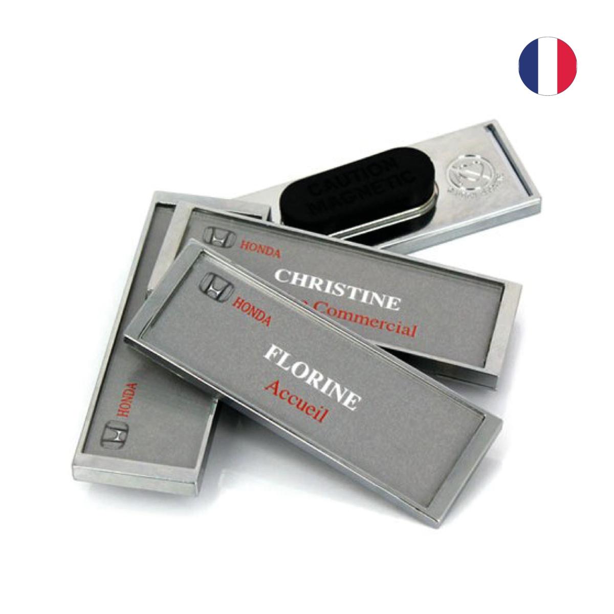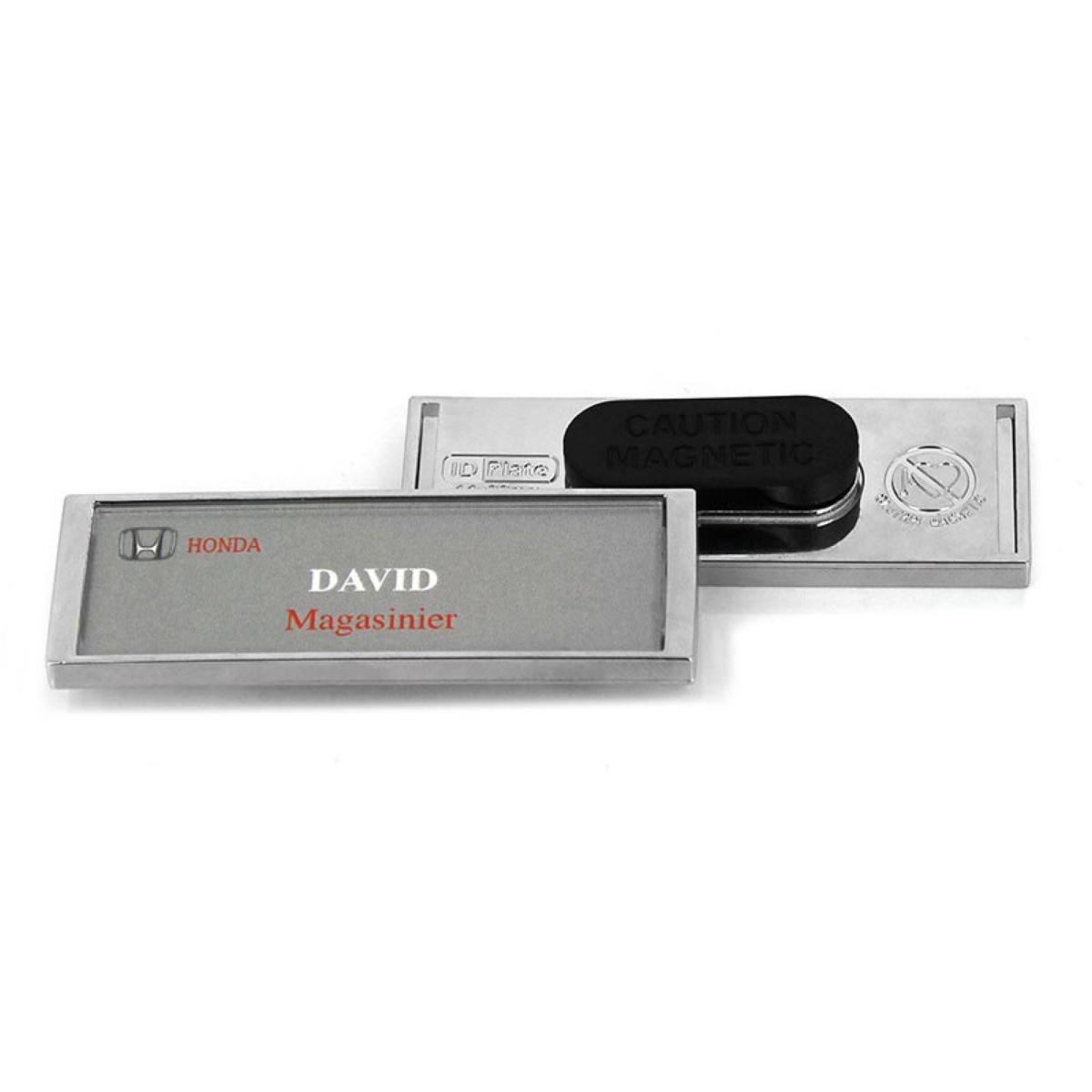 Badge d'identification gris brillant. Elégant et fonctionnel, idéal pour les événements professionnels et les conférences. Attache aimantée. Dimensions 71 x 24 mm / Marquage 64 x 22 cm / Epaisseur 3 mm. Impression numérique de haute qualité protégée par une loupe brillante. Fabriqué en France.