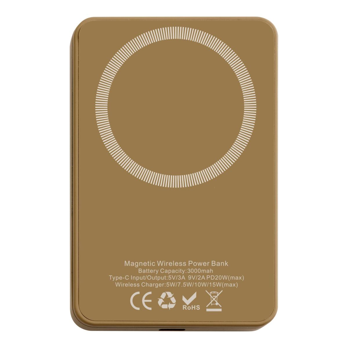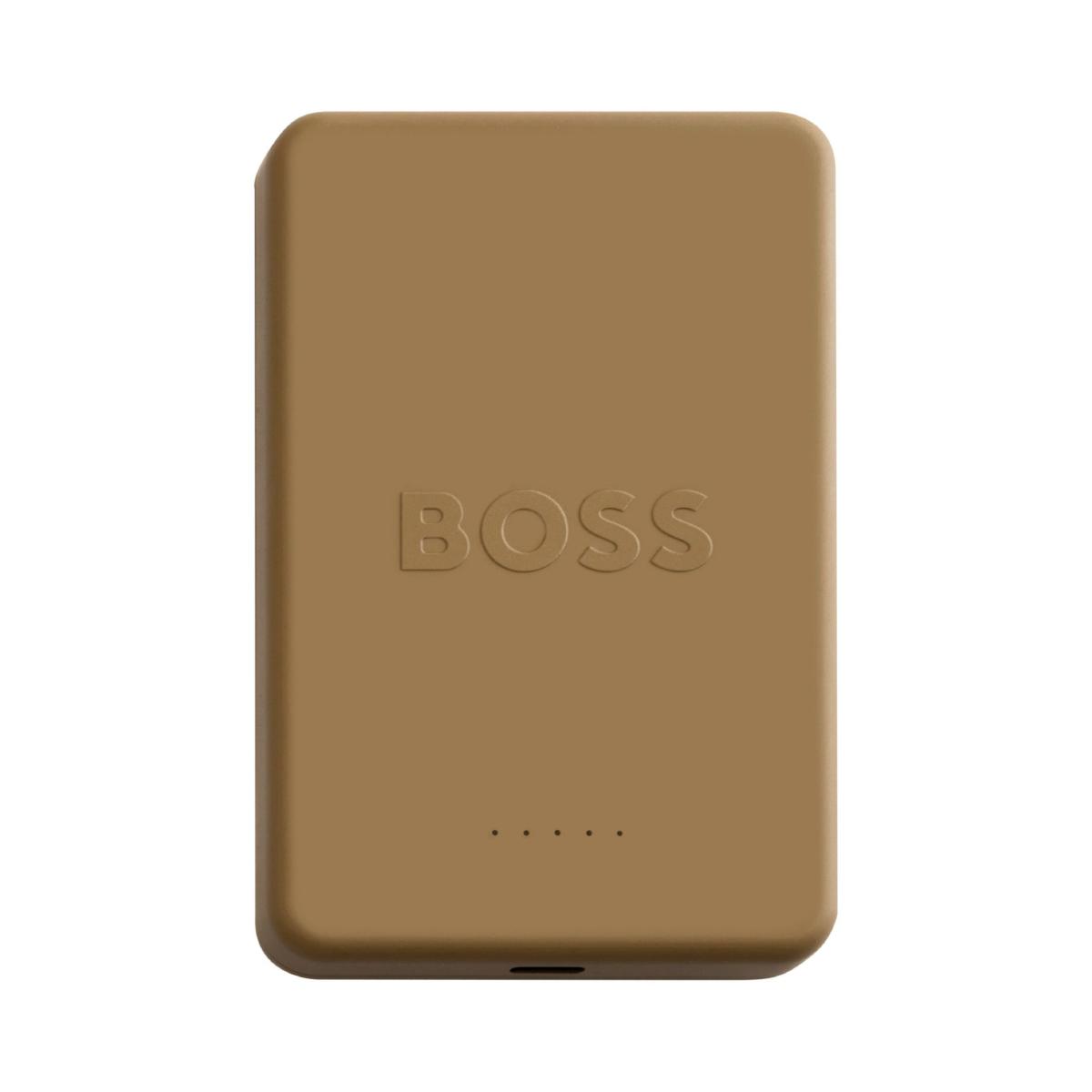 Batterie de secours, de la marque Hugo Boss. Léger et résistant aux chocs. Finition douce au toucher. Logo 3D. Chargeur de téléphone magnétique. Port USB-C. Technologie de chargeur sans fil Universal Qi. Batterie au cobalt durable et efficace. 3,7V/3000 mAh. 15W (max).