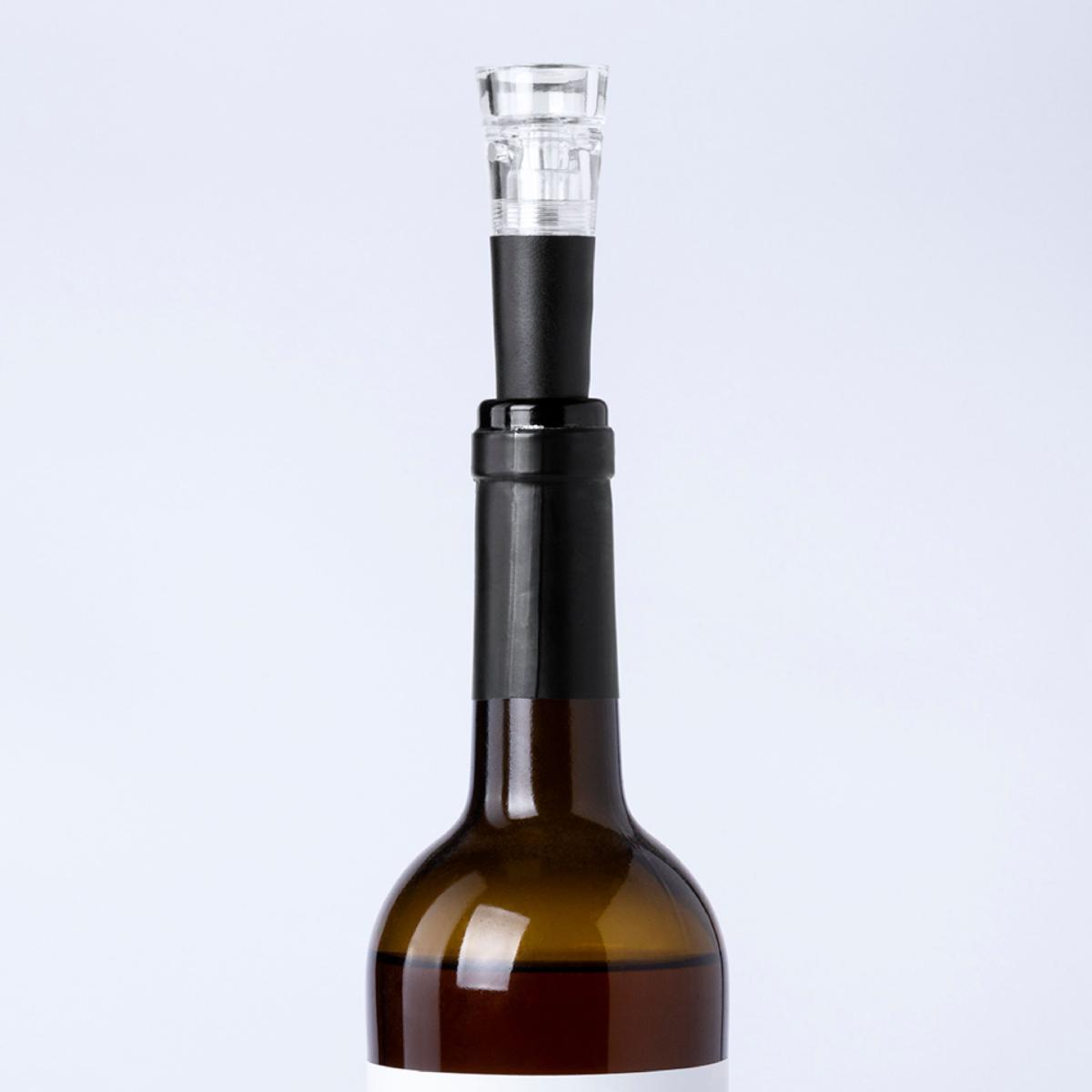 Bouchon de bouteille de vin noir avec pompe à air transparente. Zone métallique de Ø 2 cm sur le dessus avec film protecteur. Présentation individuelle.