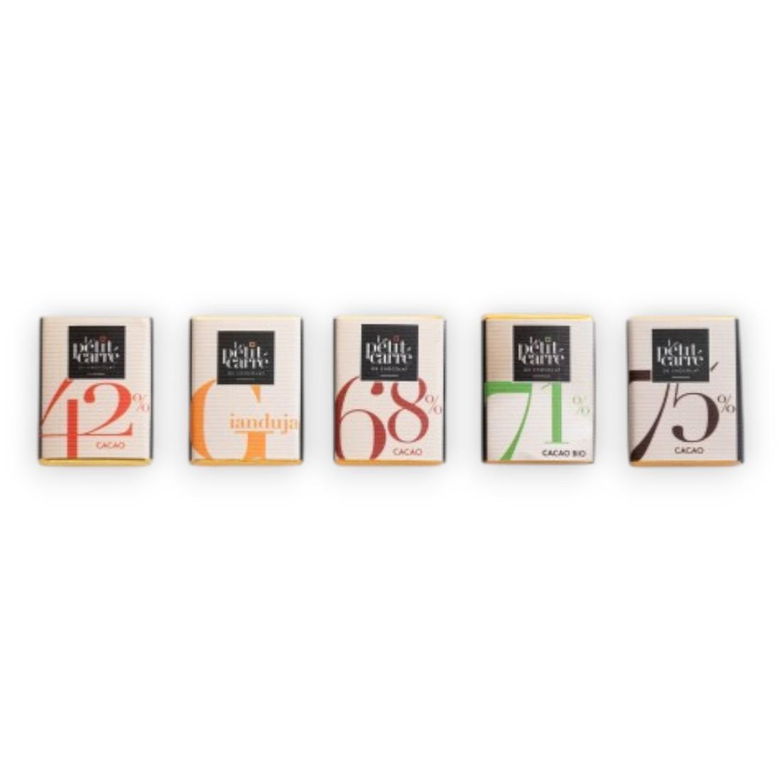 5 Saveurs de chocolat en carrés 5 g : 42% Glanduja, 68%, 71% et 75%