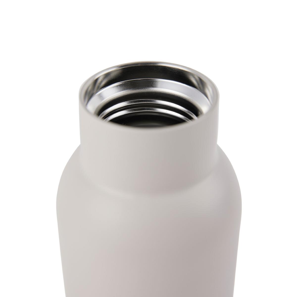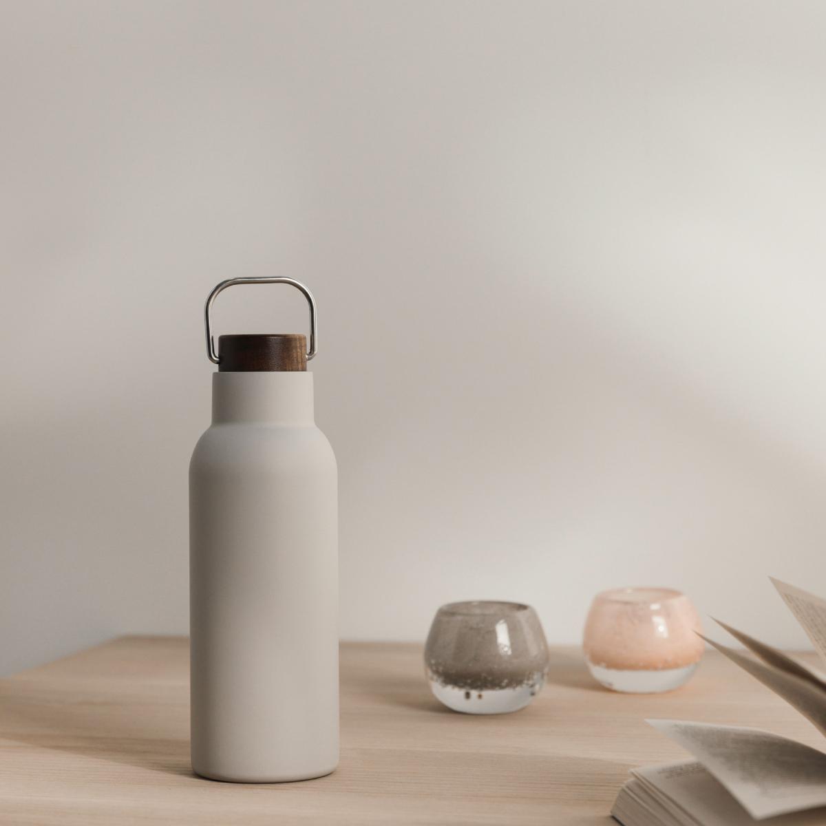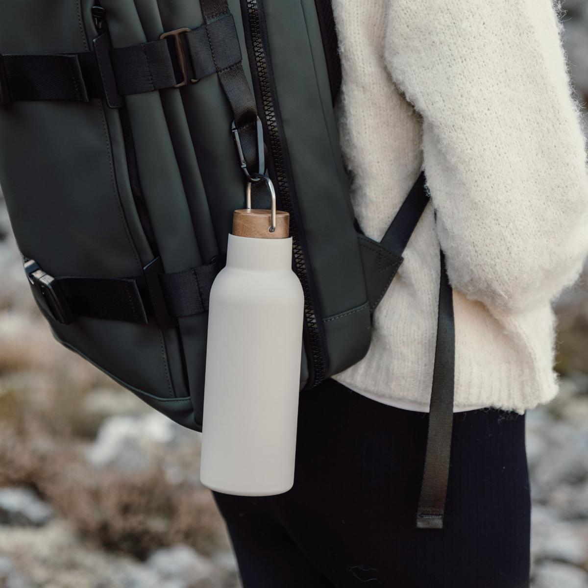 Bouteille isotherme en acier inoxydable recyclé certifié RCS. Couvercle en bois d'acacia avec boucle en métal. Bouteille sous vide, à double paroi pour conserver la température intacte longtemps (boissons chaudes ou froides). Certifiée par RCS (Recycled Claim Standard) garantissant la certification de l'ensemble de la chaîne d'approvisionnement des matériaux recyclés. Emballage kraft certifié FSC® inclus.
