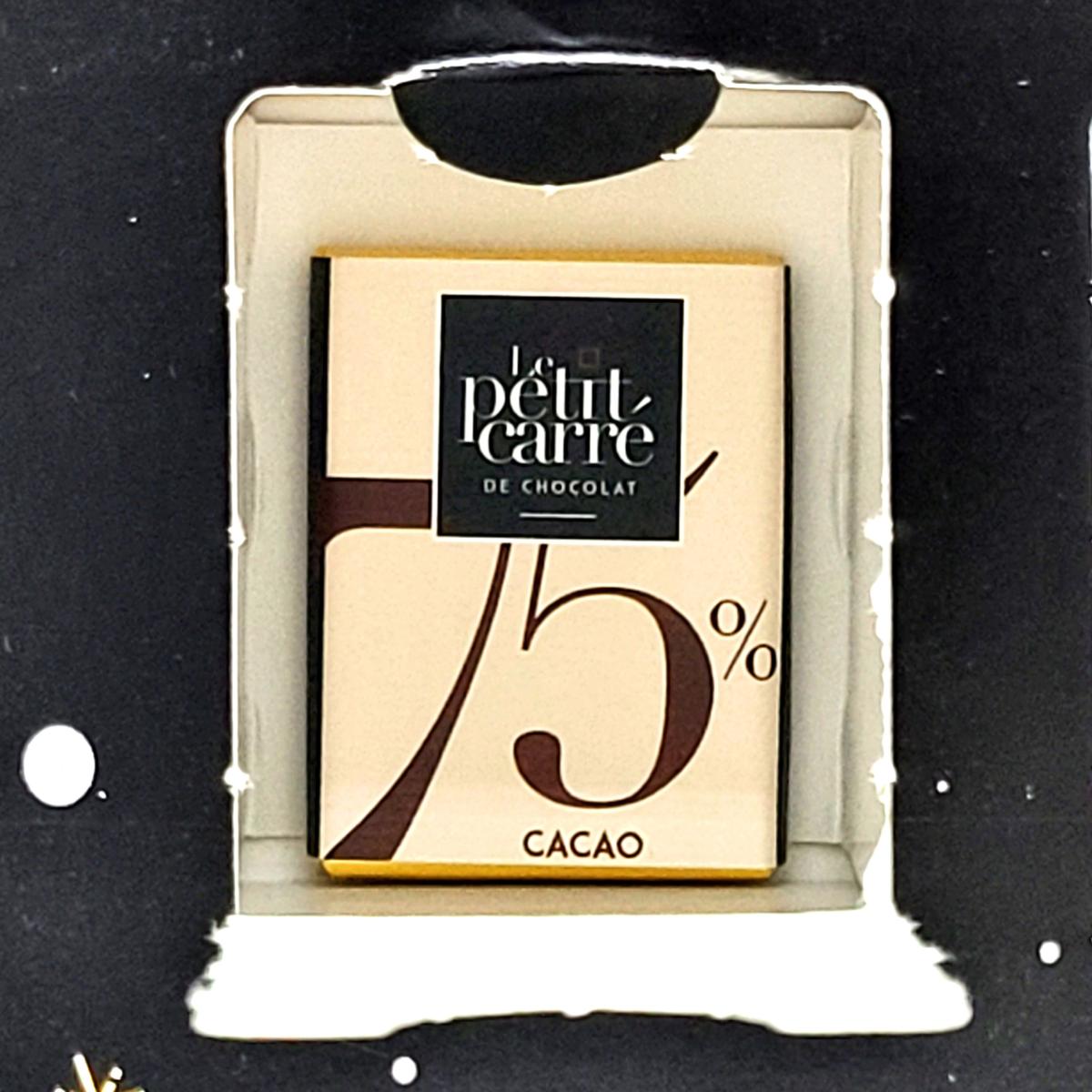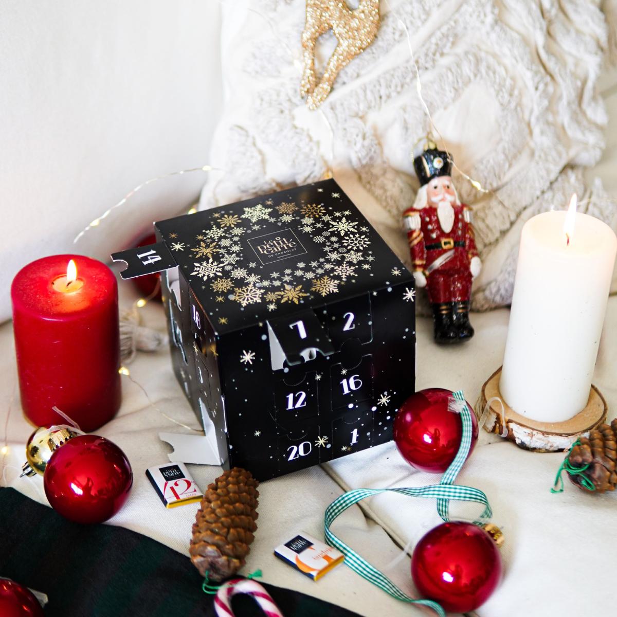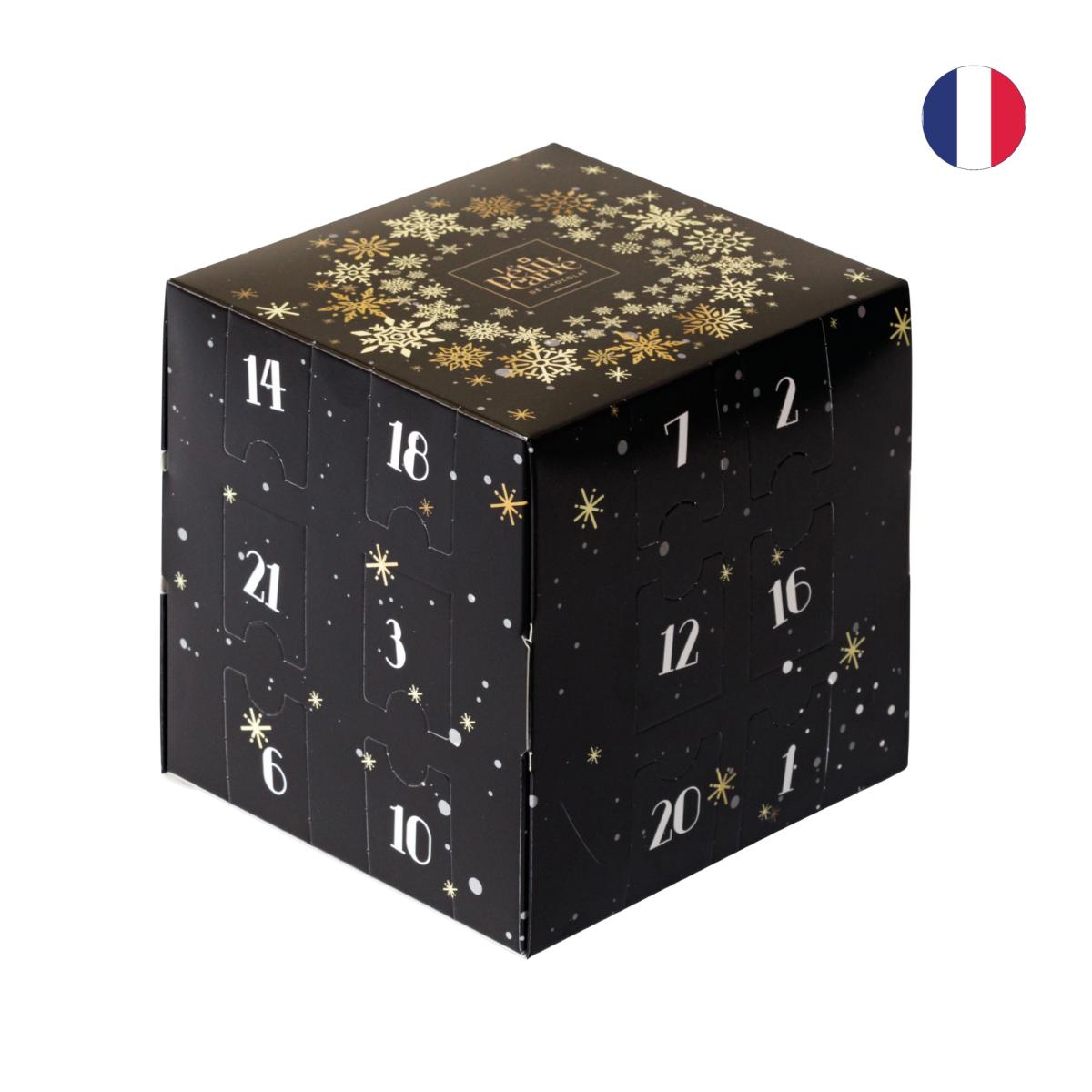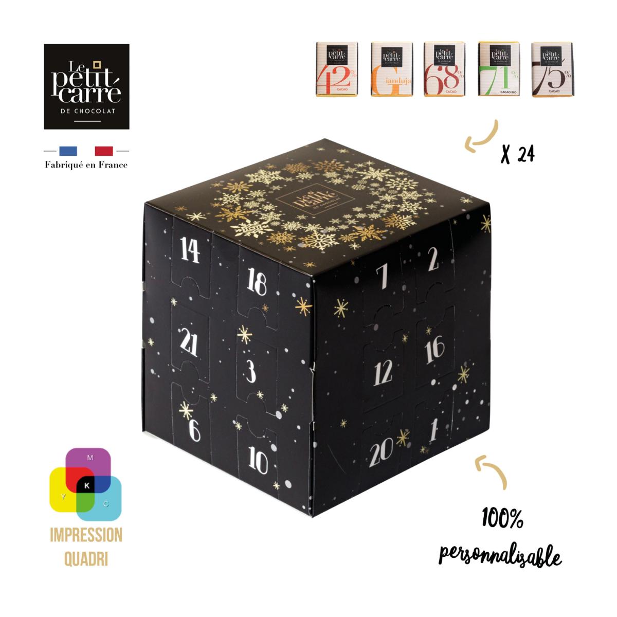Calendrier de l'Avent cubique - Le Petit Carré de Chocolat. Contient 24 carrés de chocolat avec mix de saveurs (Gianduja - 42%, Lait - 68%, Mexique - 71%, BIO - 75% Tanzanie). Dimensions : 140 x 140 x 140 mm.