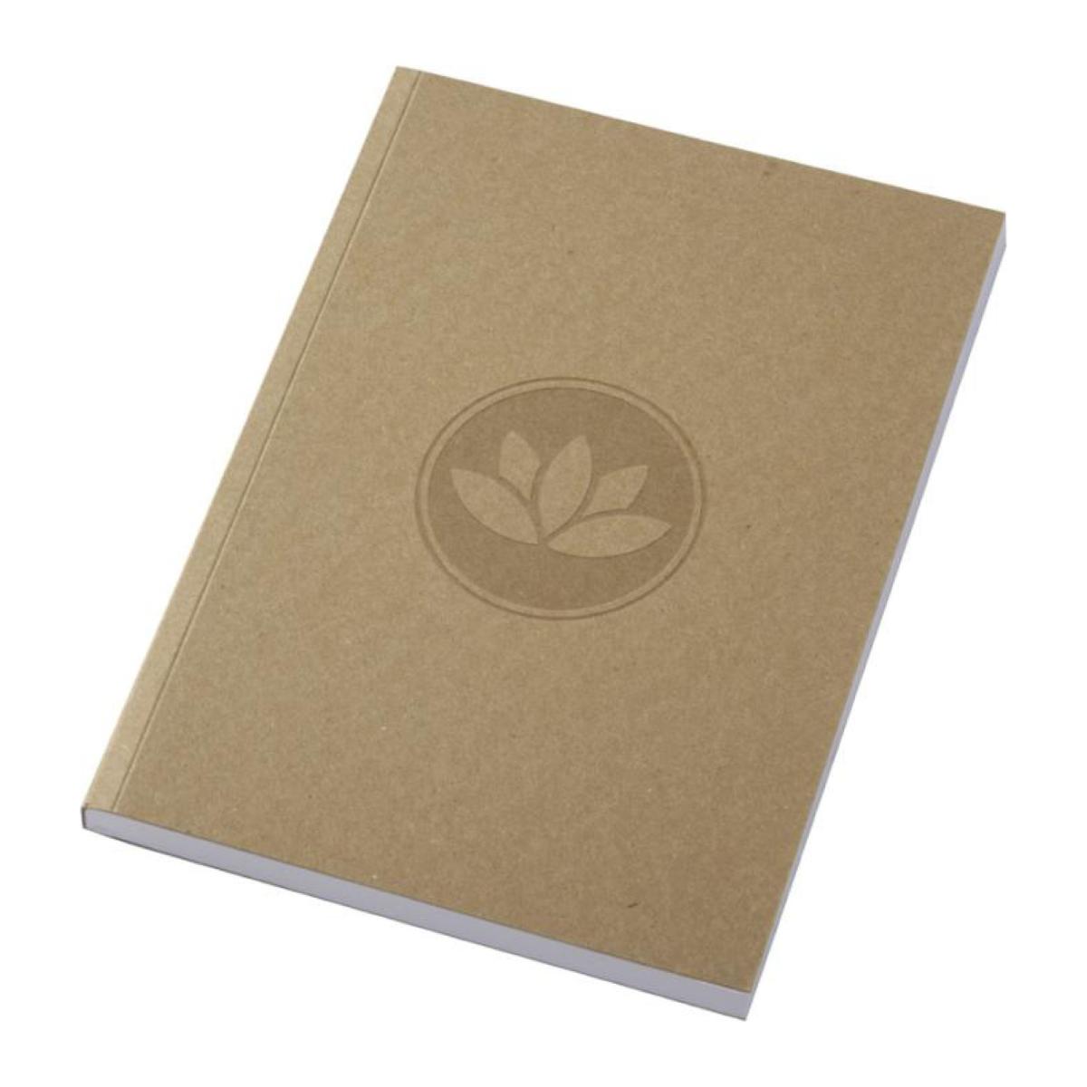 Carnet A5 à couverture souple recyclée en kraft. Contient 100 feuilles de papier recyclé de 80 g/m². Feuilles unies (standard), pour l’ajout de dessins, de lignes, de carrés ou de dessins personnalisés. Possibilité d'ajouter des inserts de pages avec une finition brillante à l’avant du carnet. Couverture en carton kraft naturel de 350 g/m². Possibilité d'ajouter une impression en couleur sur l’ensemble de la couverture (recto, verso, dos). Fabriqué au Royaume-Uni. Papier recyclé, Papier Kraft recyclé. FSC Recycled 100%.