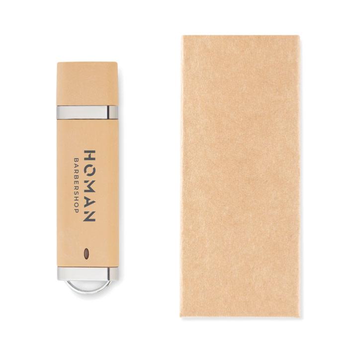 Clé USB avec boîtier en paille et PP. Dimensions : 74 x 20 x 7,5 mm. Livré dans une boîte en papier kraft marron.