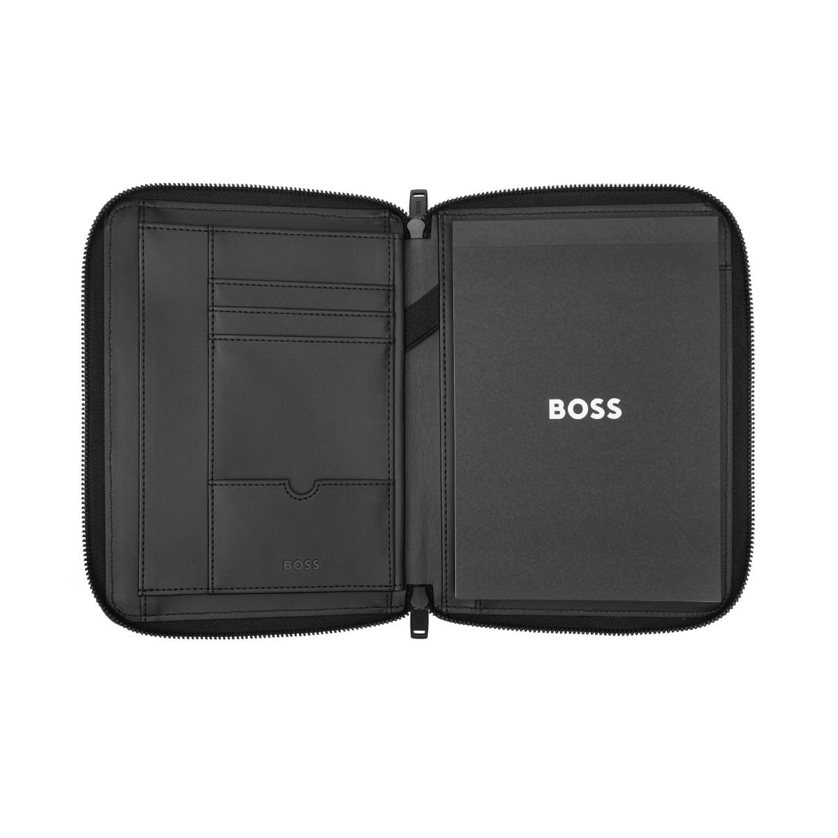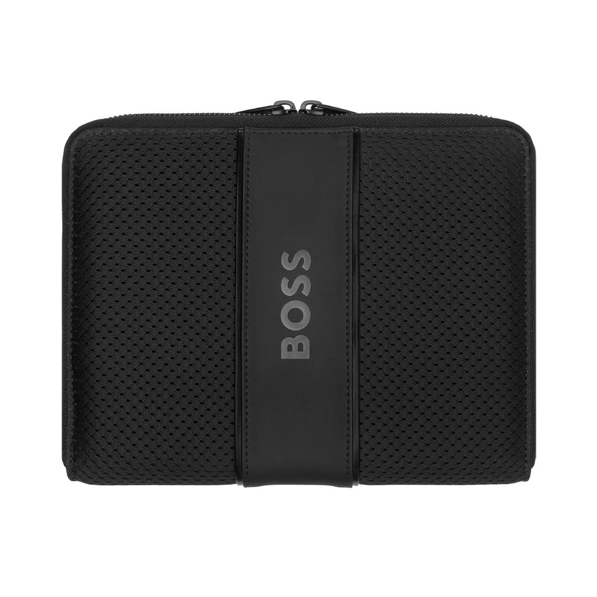 Conférencier A5 de la marque Hugo Boss. Design contemporain. PU à finition en caoutchouc. Expérience tactile active et attrayante. Logo Boss surdimensionné en relief. Fermetures à glissière noires mates.