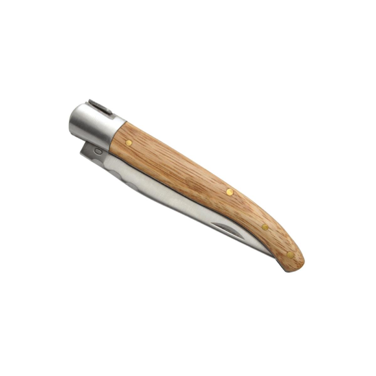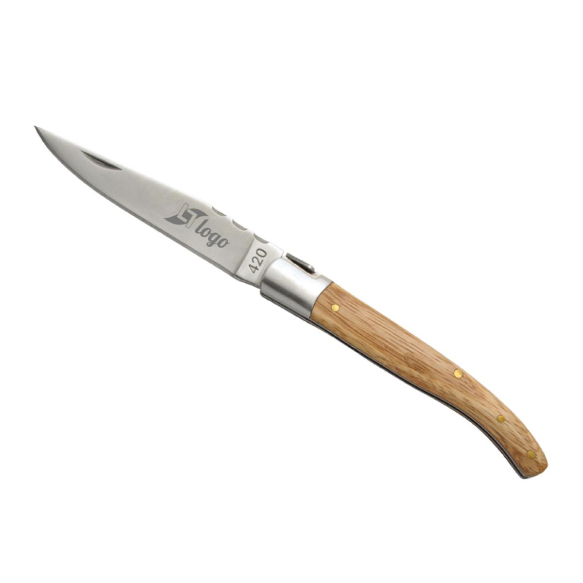Couteau pliant avec lame en acier inoxydable 420. Lame résistante à l'oxydation. Système de blocage de lame avec cran forcé. Manche en acier inoxydable et frêne exotique. Ressort guilloché. Mitre forgée en acier inoxydable. Livré avec un étui en nylon noir brodé.