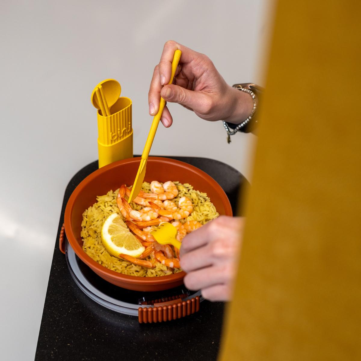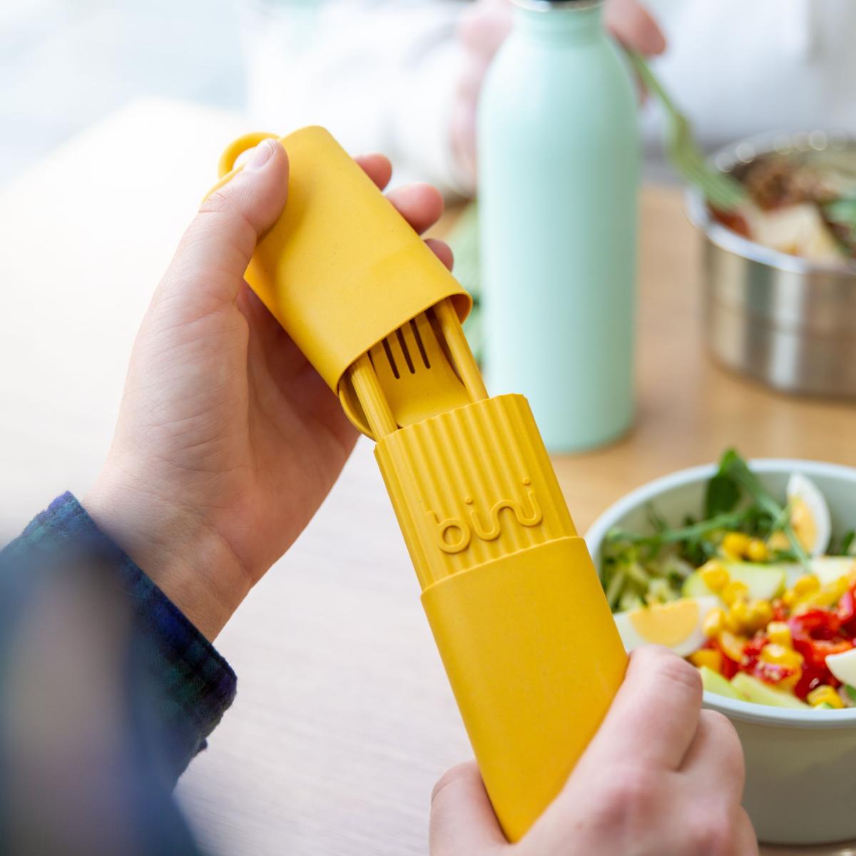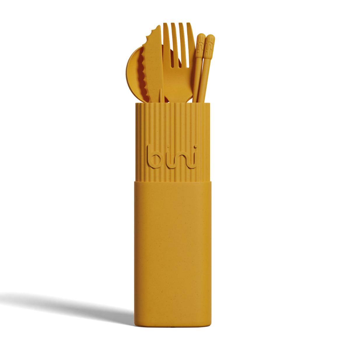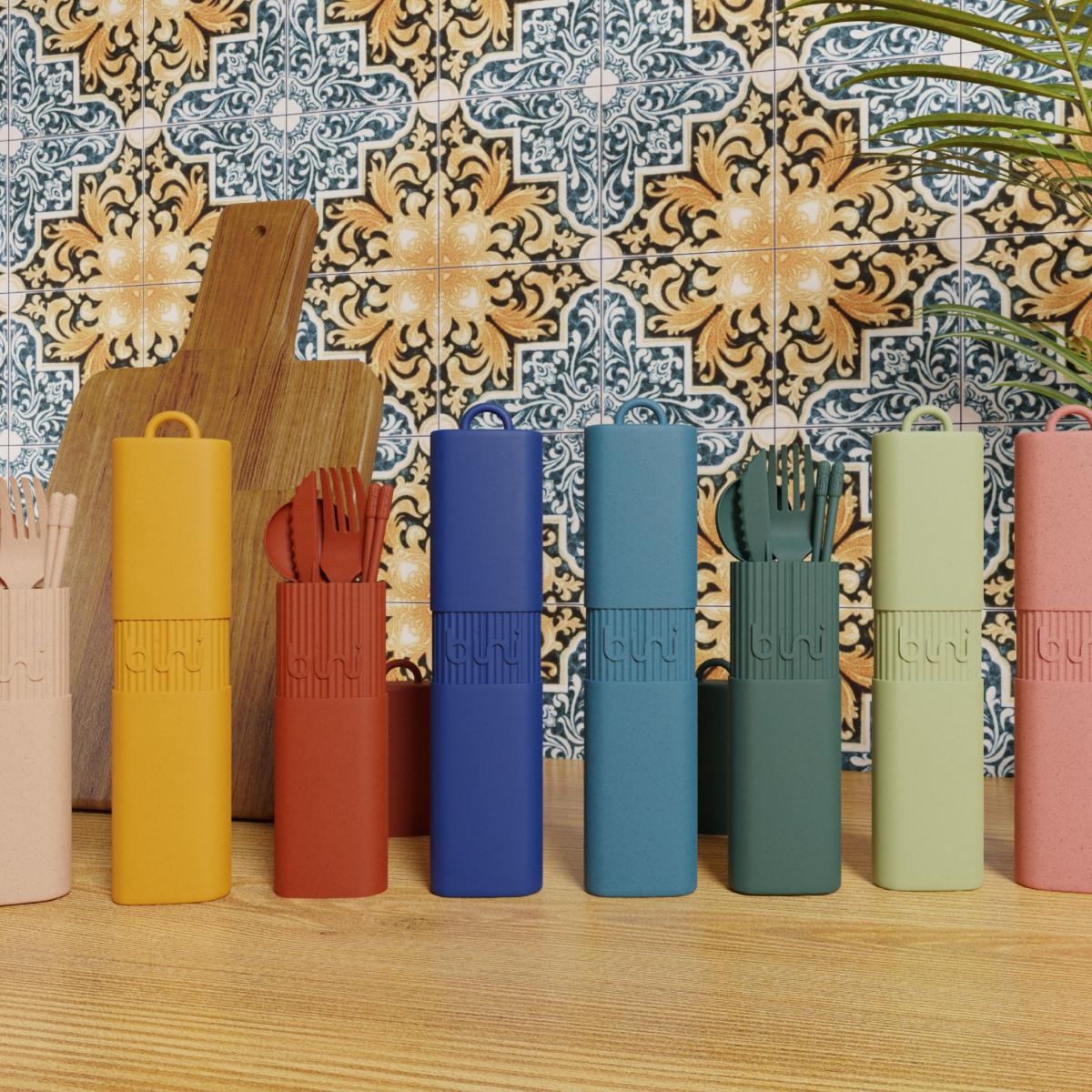 Binikit - kit de couvertes réutilisables, de la marque BINI. Design unique signé Margaux Keller, l'étui contient des petits trous pour bien laisser évacuer l'humidité après le lavage. Composé d'une fourchette, un couteau, des baguettes et une cuillère creuse; le tout dans un petit étui léger, nomade et ingénieux. Fabrication en France à partir de matières bio sourcées.