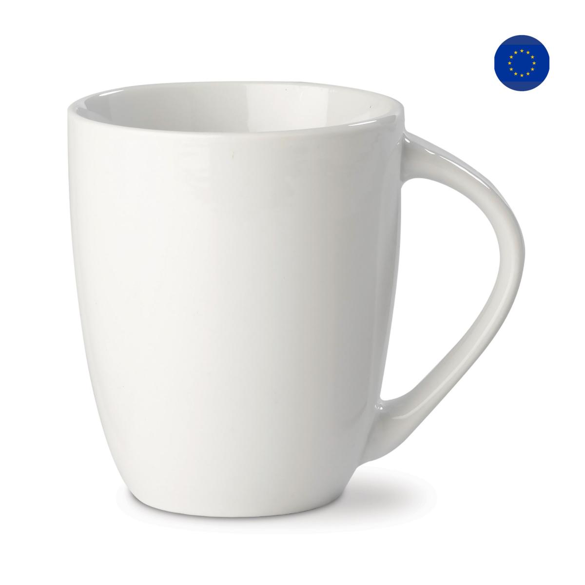 Mug blanc en porcelaine de haute qualité. Modèle conique avec grande anse. Made in Europe.
