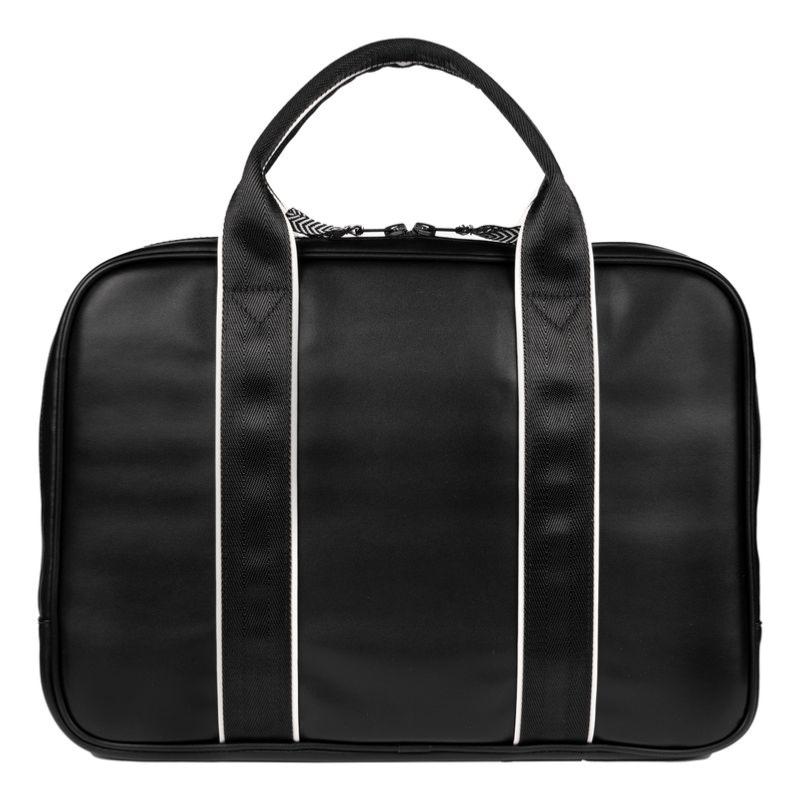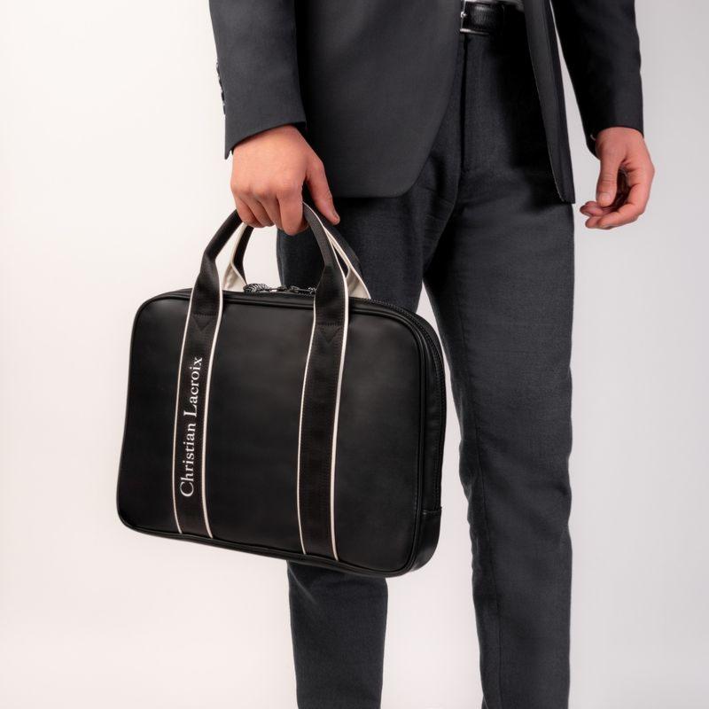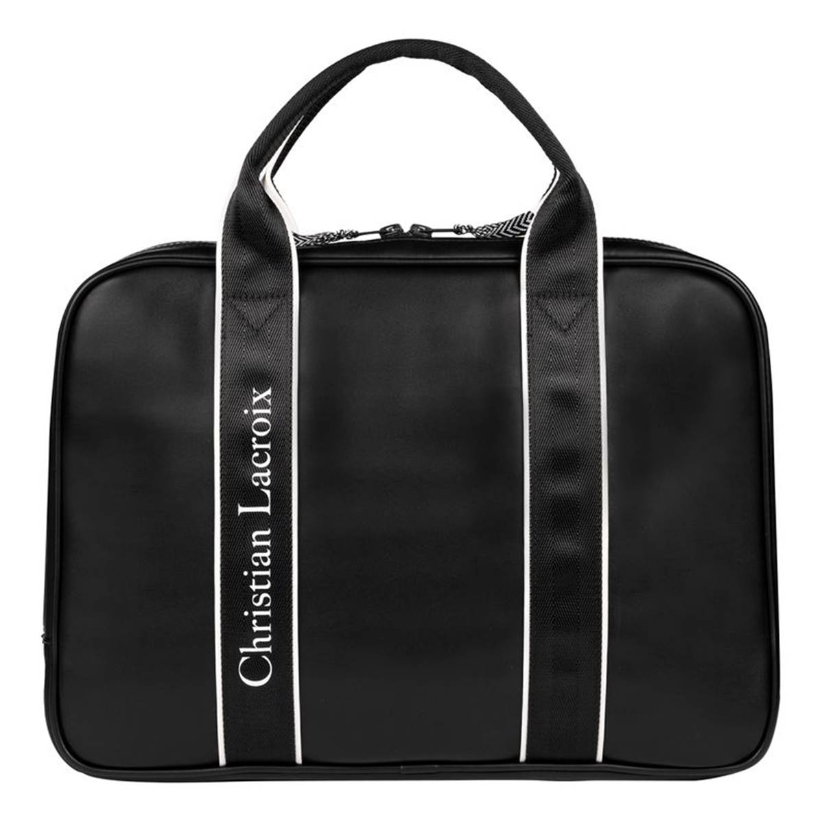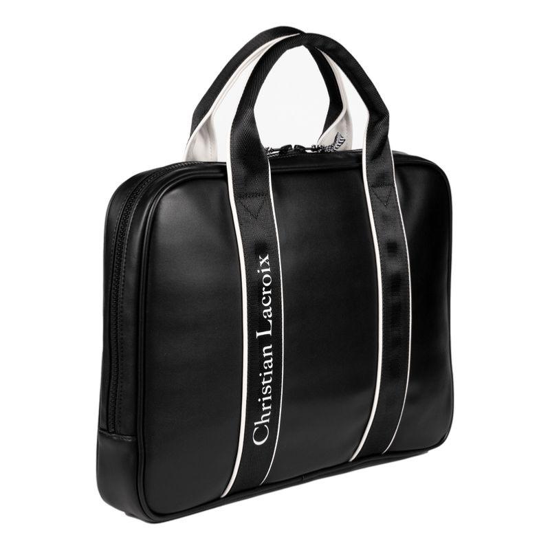 Porte-ordinateur de la marque Christian Lacroix. Cuir végétal souple et lisse. Logo iconique CHRISTIAN LACROIX surdimensionné. Sangle imprimée en guise de signature. Imprimé chevron iconique sur la tirette de fermeture éclair