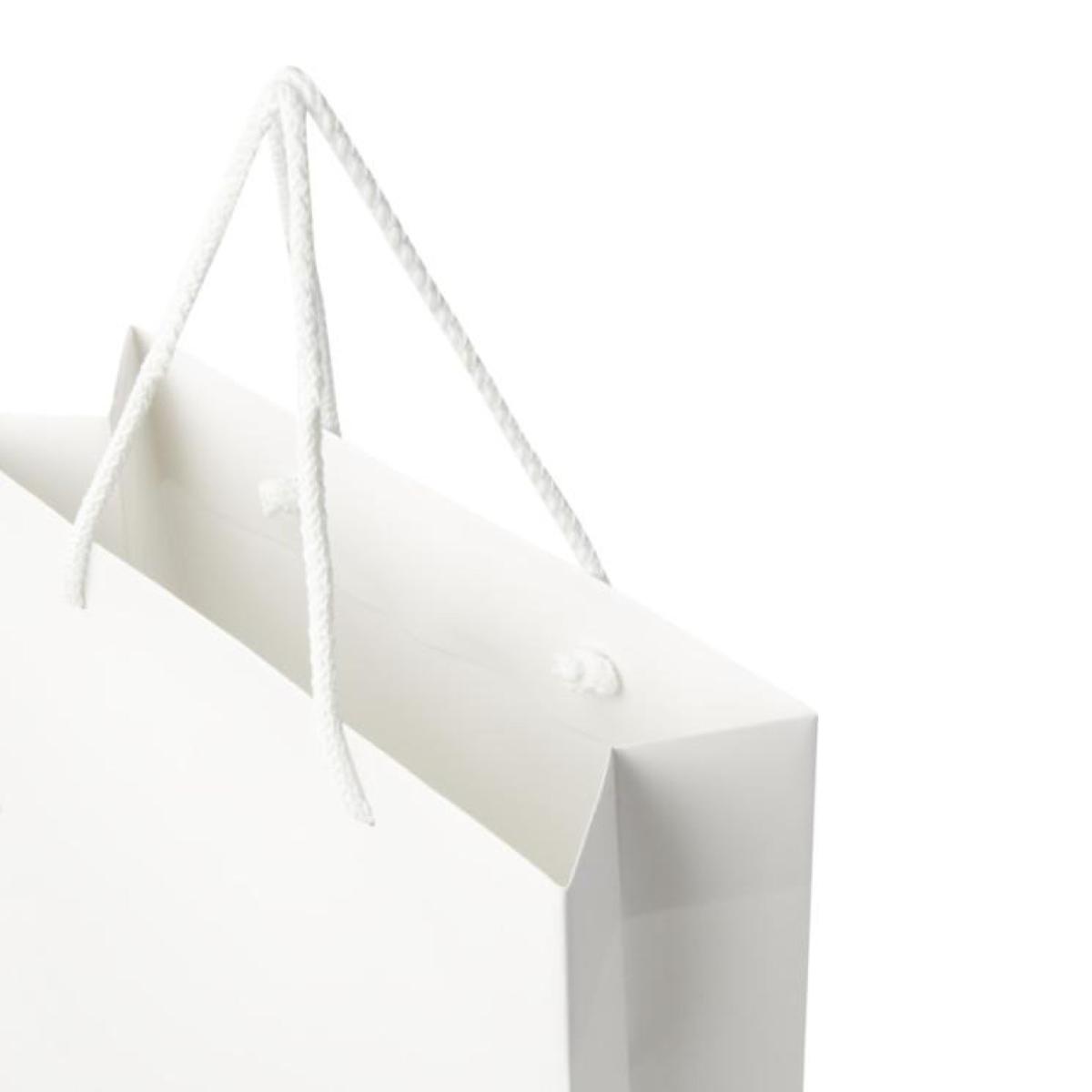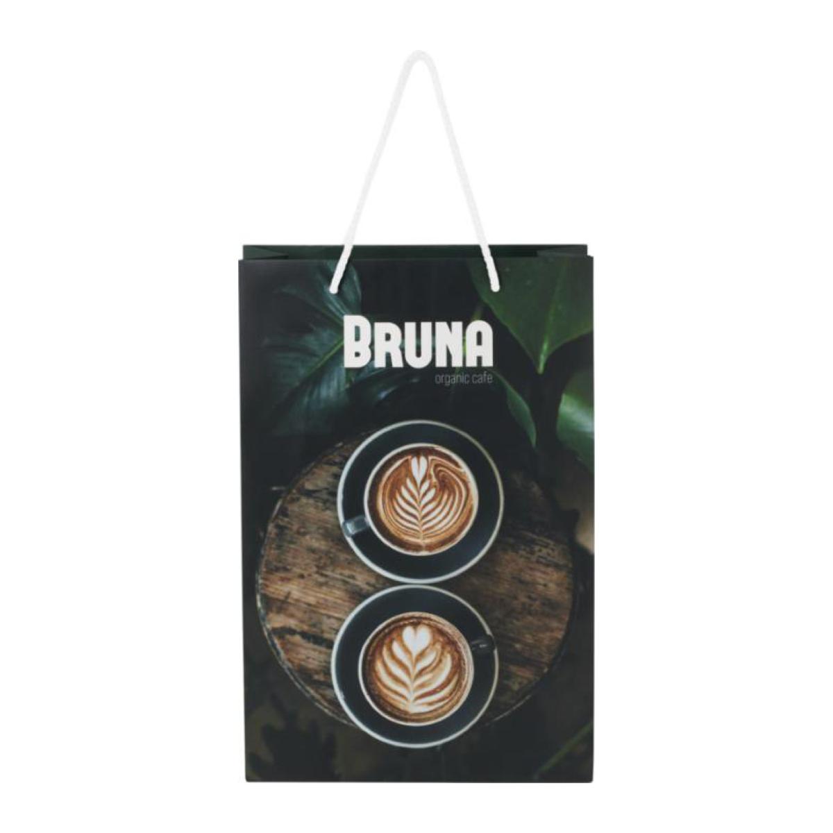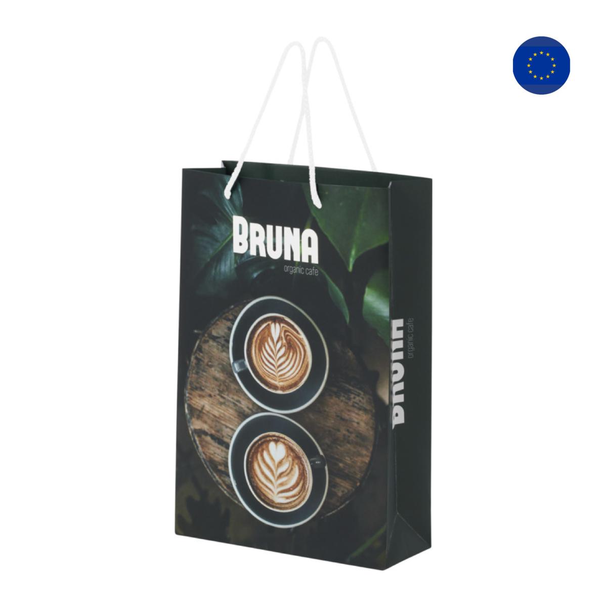 Grand sac en papier de 170 g/m2 mat artisanal (24 x 9 x 36 cm) avec poignées torsadées en plastique. L'avant et l'arrière personnalisables offrent suffisamment d'espace pour l'impression d'un logo, ou de tout autre design. Fabrication en Europe.