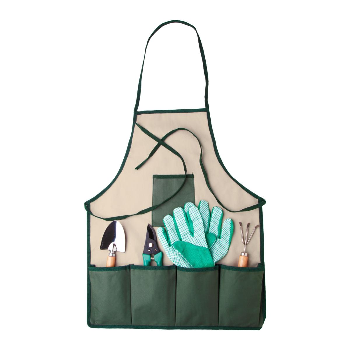 Set d?outils de jardin dans un tablier en nylon. Il comprend des ciseaux pour élaguer, un râteau, une petite pelle et une paire de gants.