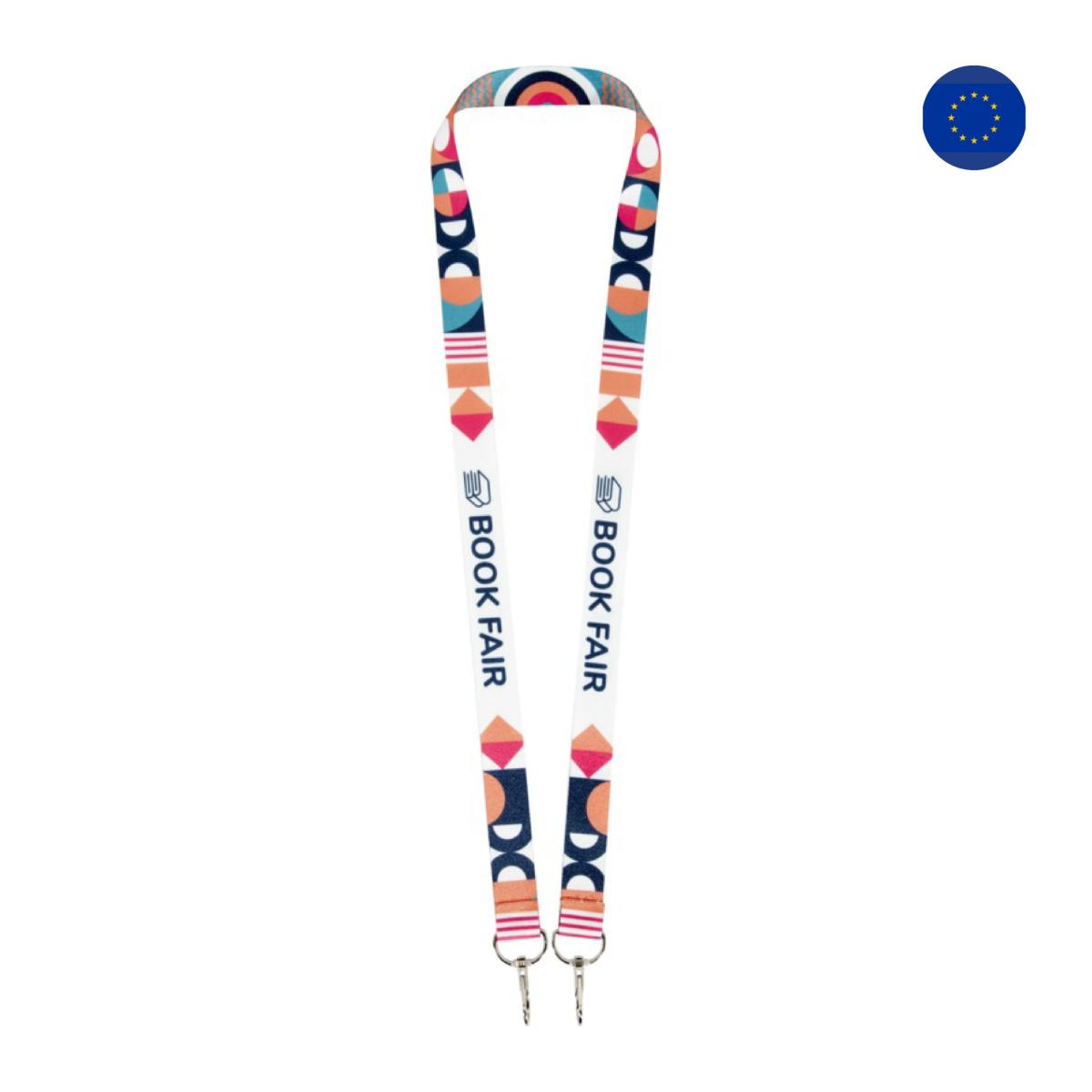 Lanyard pour sublimation en RPET avec design entièrement coloré et deux crochets en métal. Permet d'accrocher un badge nominatif, une carte d’identité ou des clés. Disponible en 4 largeurs différentes : 10, 15, 20 et 25 mm.